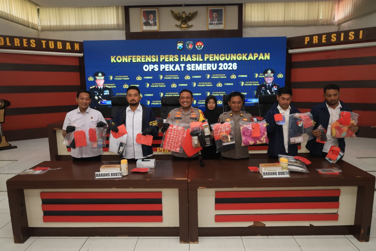JATIM MEMANGGIL - Polres Tuban menggelar konferensi pers pengungkapan kasus dalam rangka Operasi Penyakit masyarakat (Pekat) Semeru 2026 yang dilaksanakan di Gedung Sanika Satyawada Mapolres Tuban.